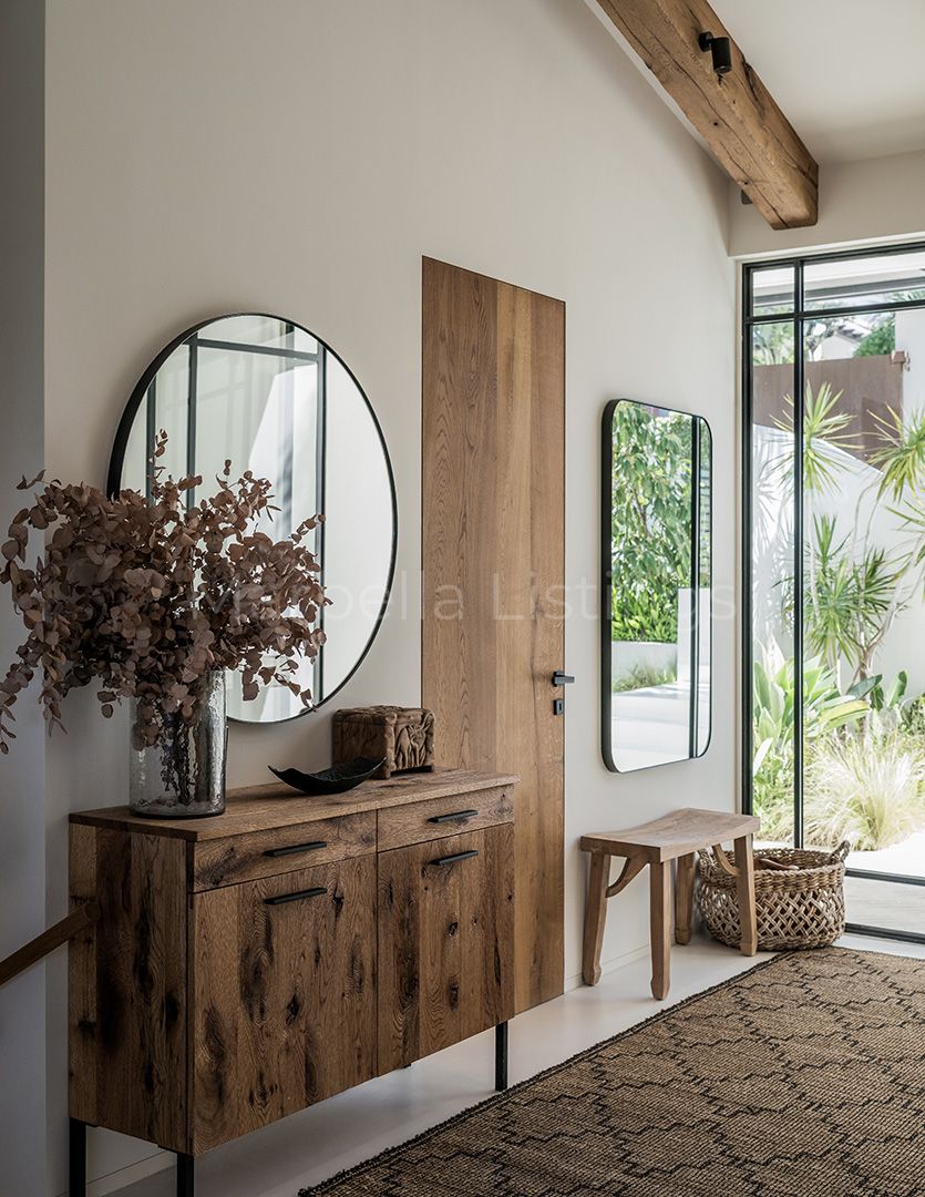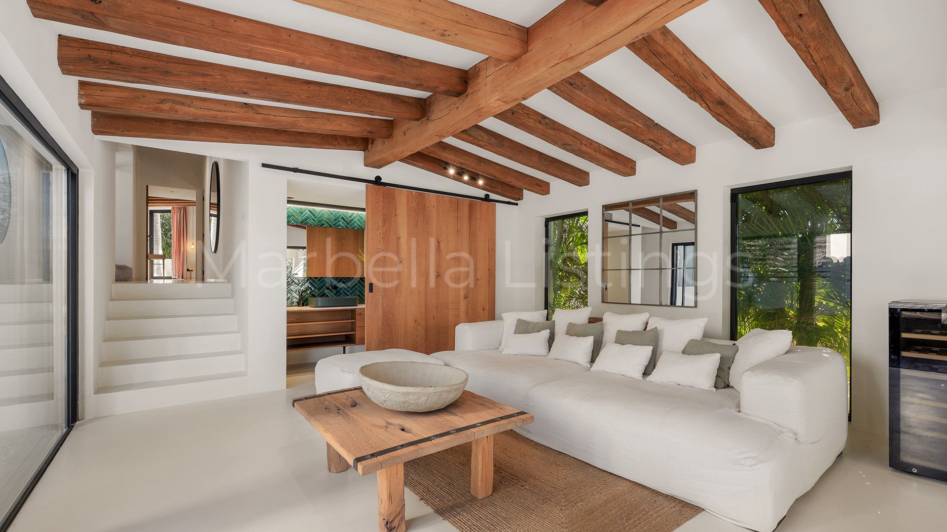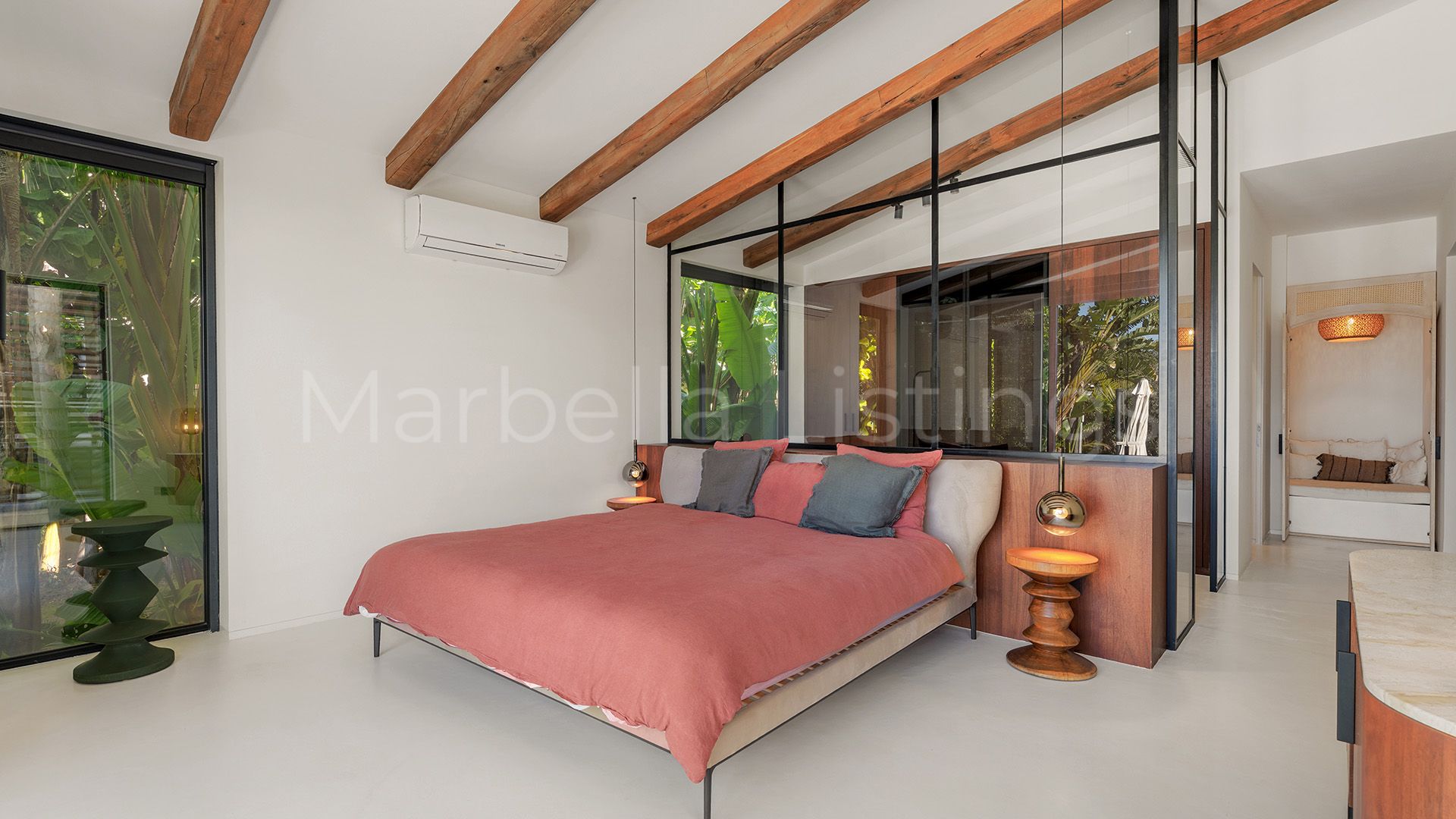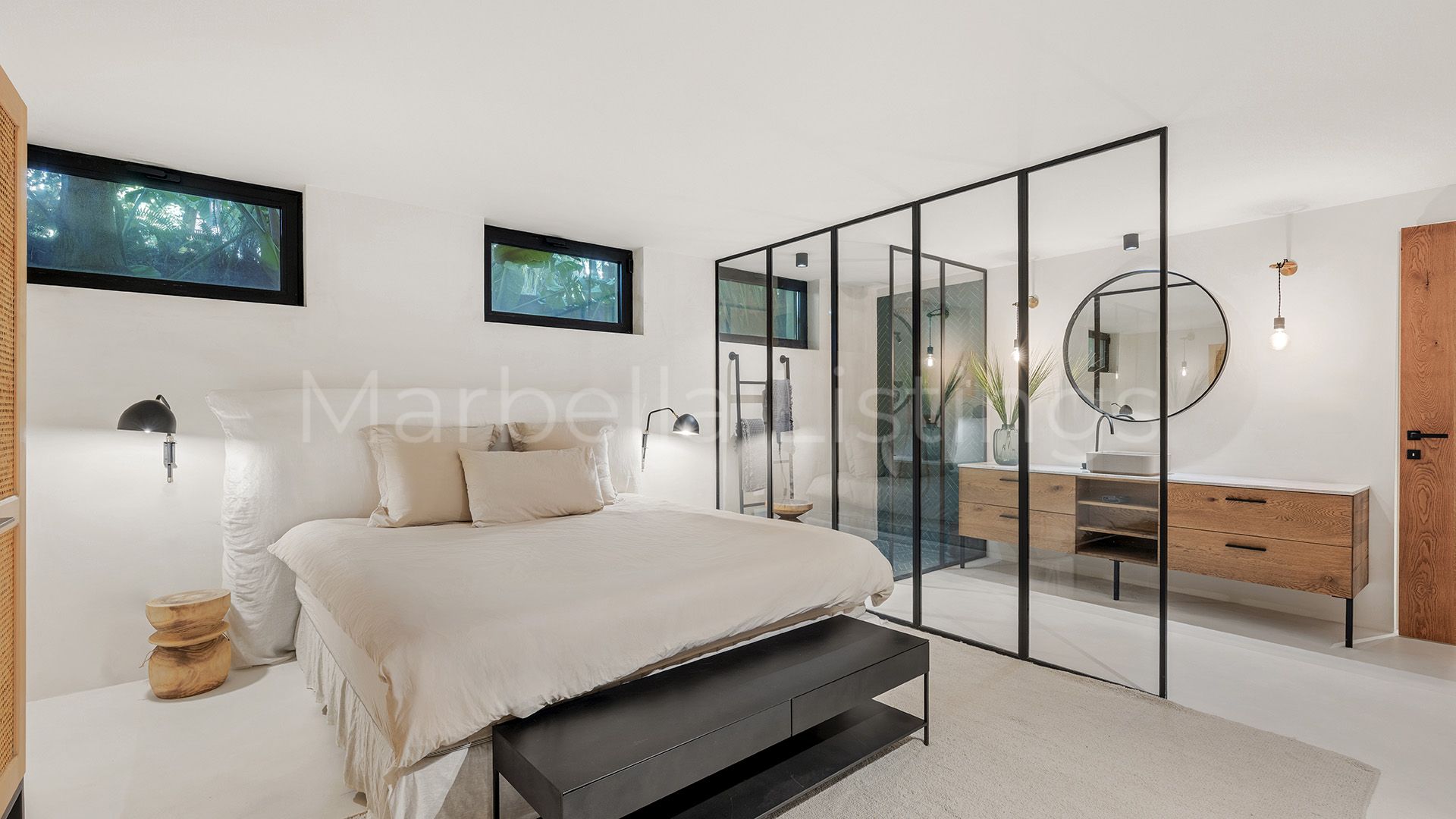Inside, the villa combines matching walls, high ceilings with warm wooden beams and large windows, even in the bathrooms, that let in natural light and greenery without sacrificing privacy. The main floor features a spacious living room, an open plan kitchen with bar, a dining room and a cosy sitting room with floating fireplace, which integrates perfectly with the outdoor terrace. Furthermore, there is a guest toilet, three en suite bedrooms, and a master suite with a spacious bathroom including bathtub, shower area and a glazed dressing room.