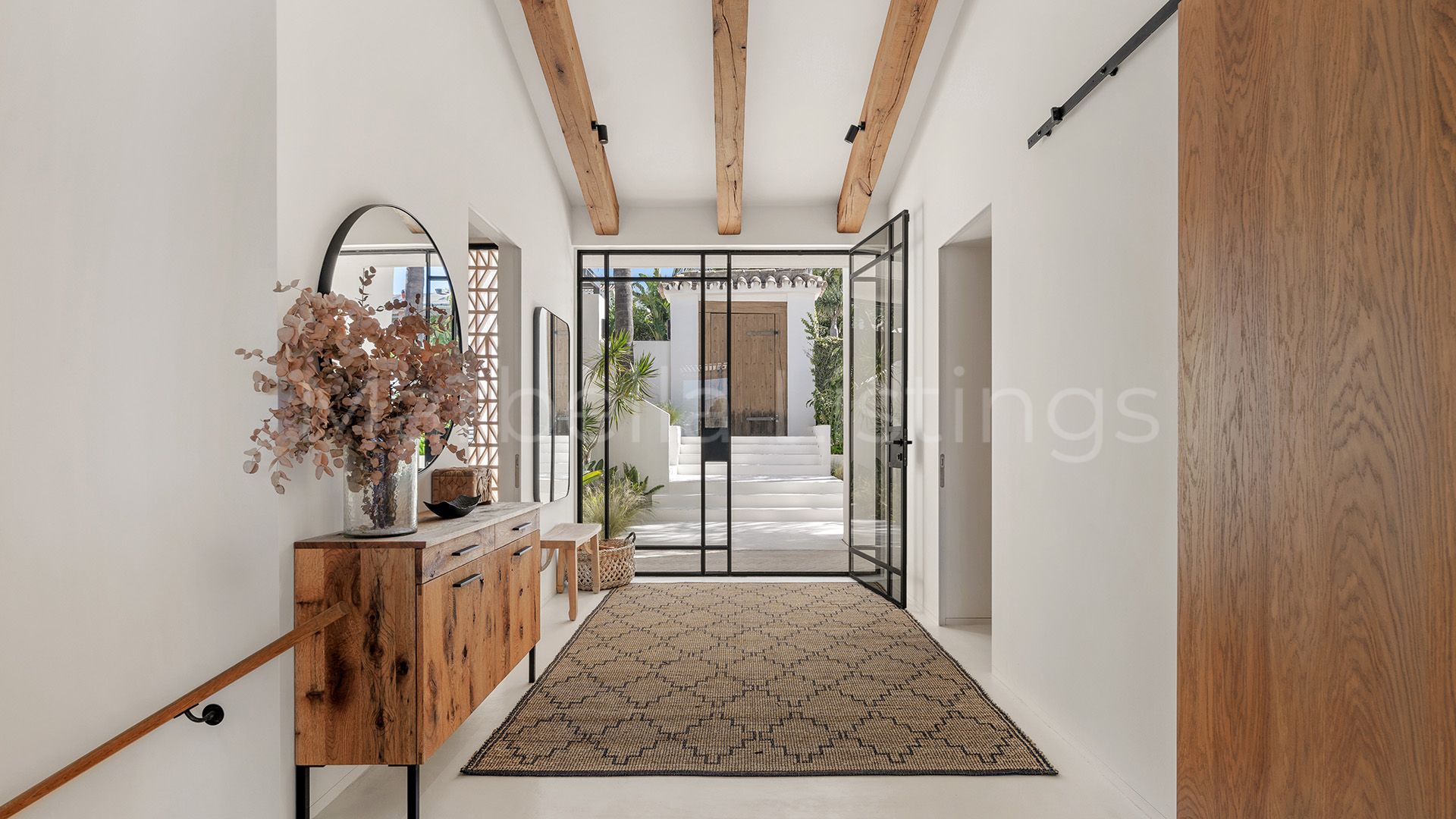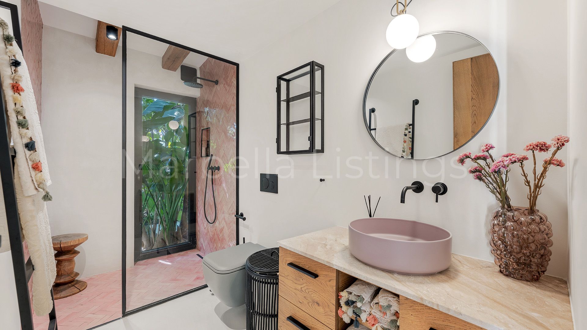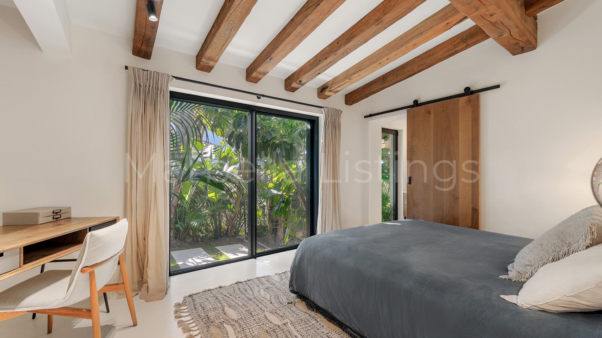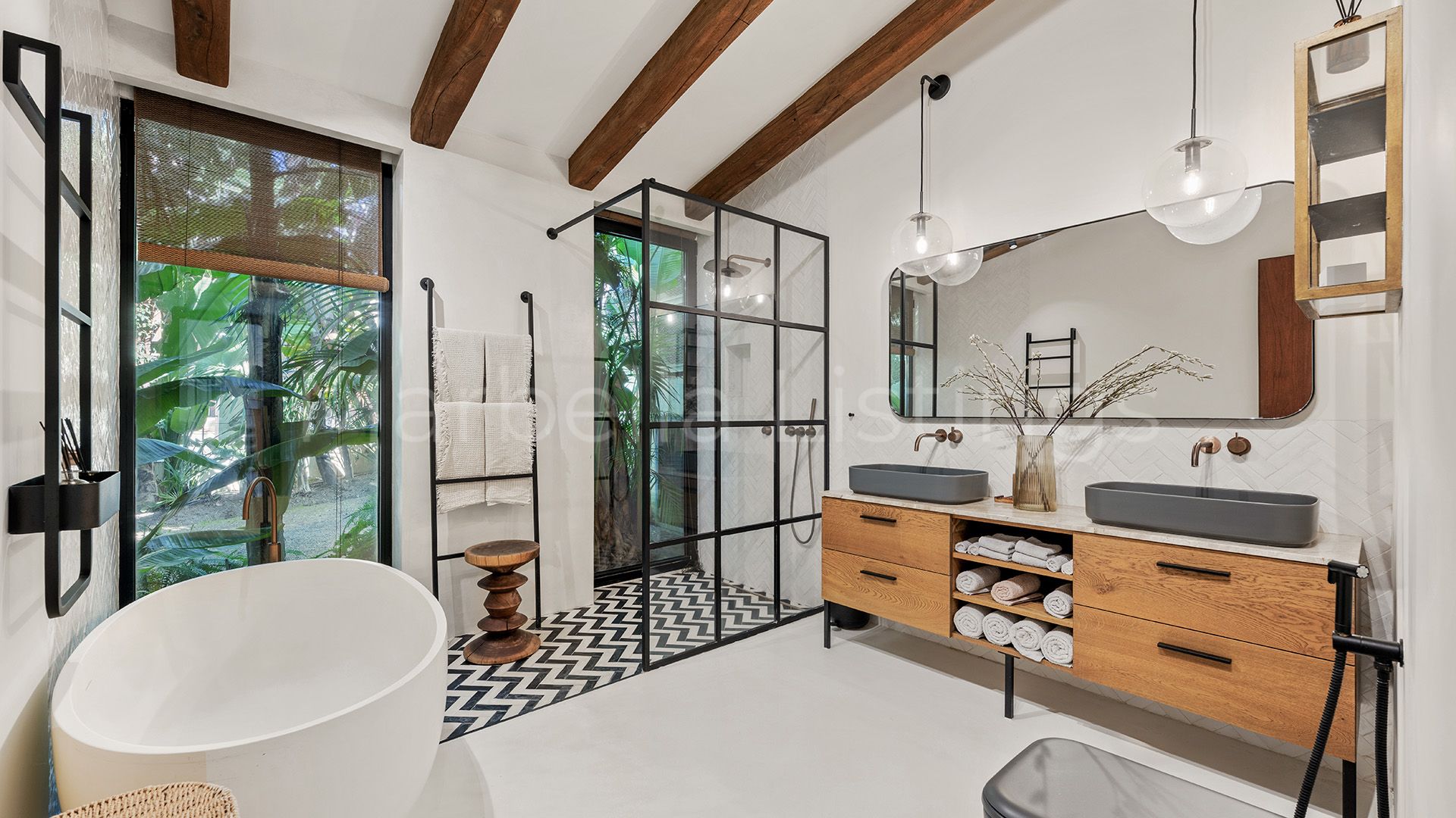 Inside, the villa combines matching walls, high ceilings with warm wooden beams and large windows, even in the bathrooms, that let in natural light and greenery without sacrificing privacy. The main floor features a spacious living room, an open plan kitchen with bar, a dining room and a cosy sitting room with floating fireplace, which integrates perfectly with the outdoor terrace. Furthermore, there is a guest toilet, three en suite bedrooms, and a master suite with a spacious bathroom including bathtub, shower area and a glazed dressing room.