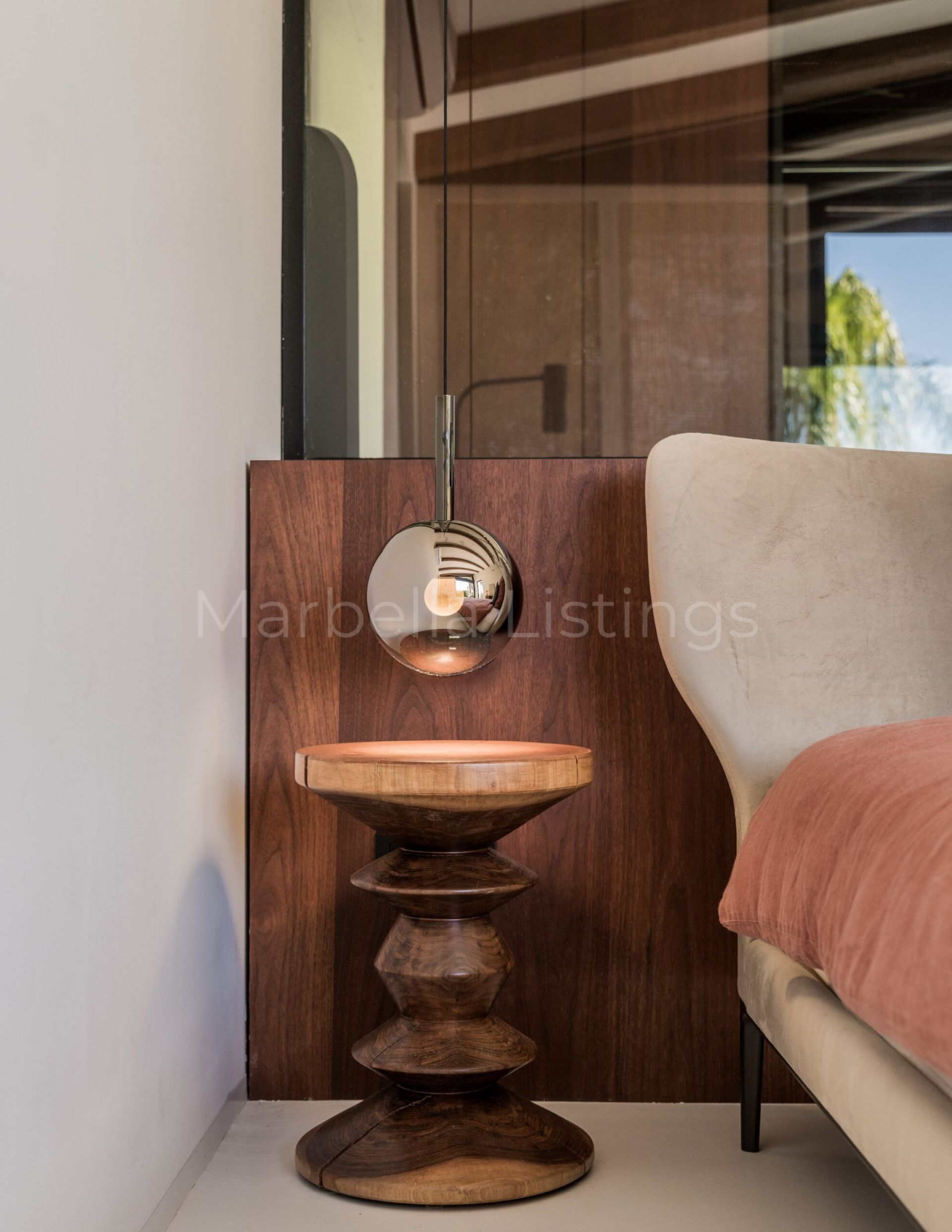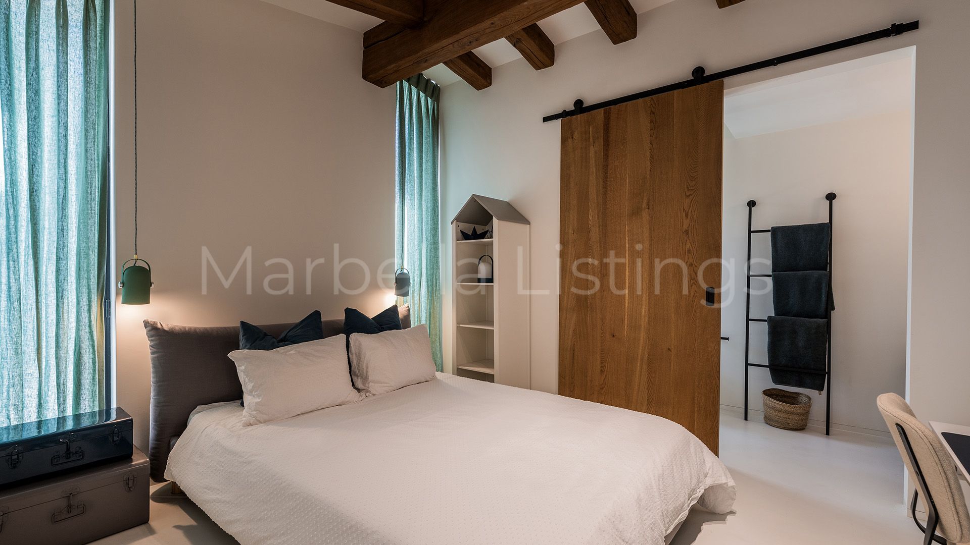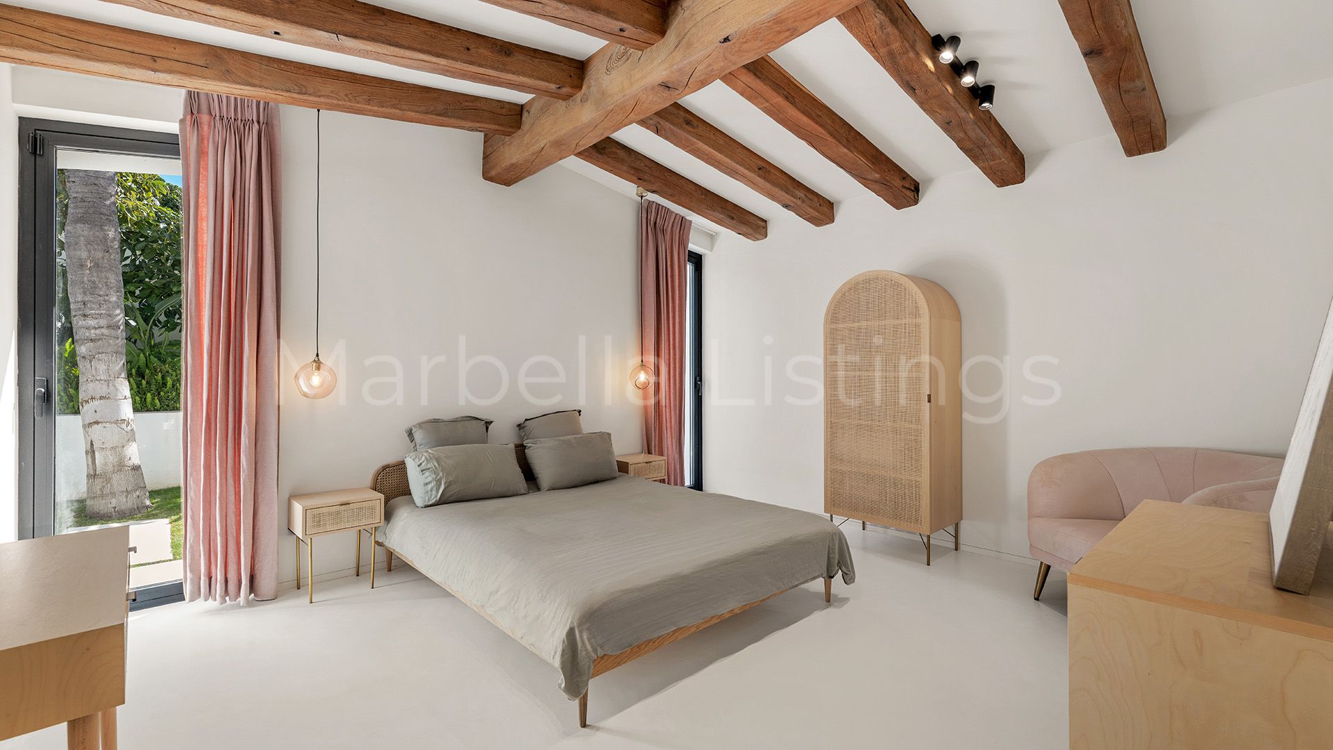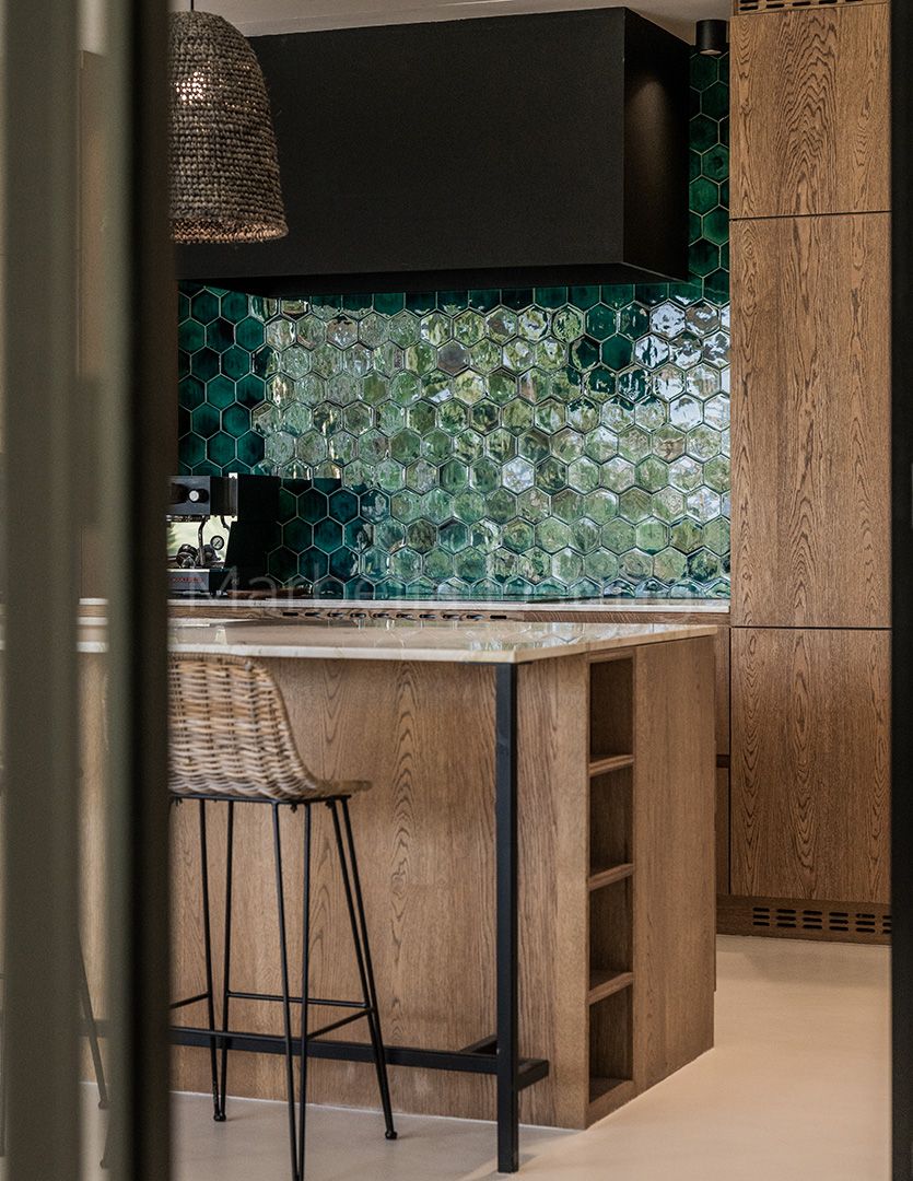 Inside, the villa combines matching walls, high ceilings with warm wooden beams and large windows, even in the bathrooms, that let in natural light and greenery without sacrificing privacy. The main floor features a spacious living room, an open plan kitchen with bar, a dining room and a cosy sitting room with floating fireplace, which integrates perfectly with the outdoor terrace. Furthermore, there is a guest toilet, three en suite bedrooms, and a master suite with a spacious bathroom including bathtub, shower area and a glazed dressing room.