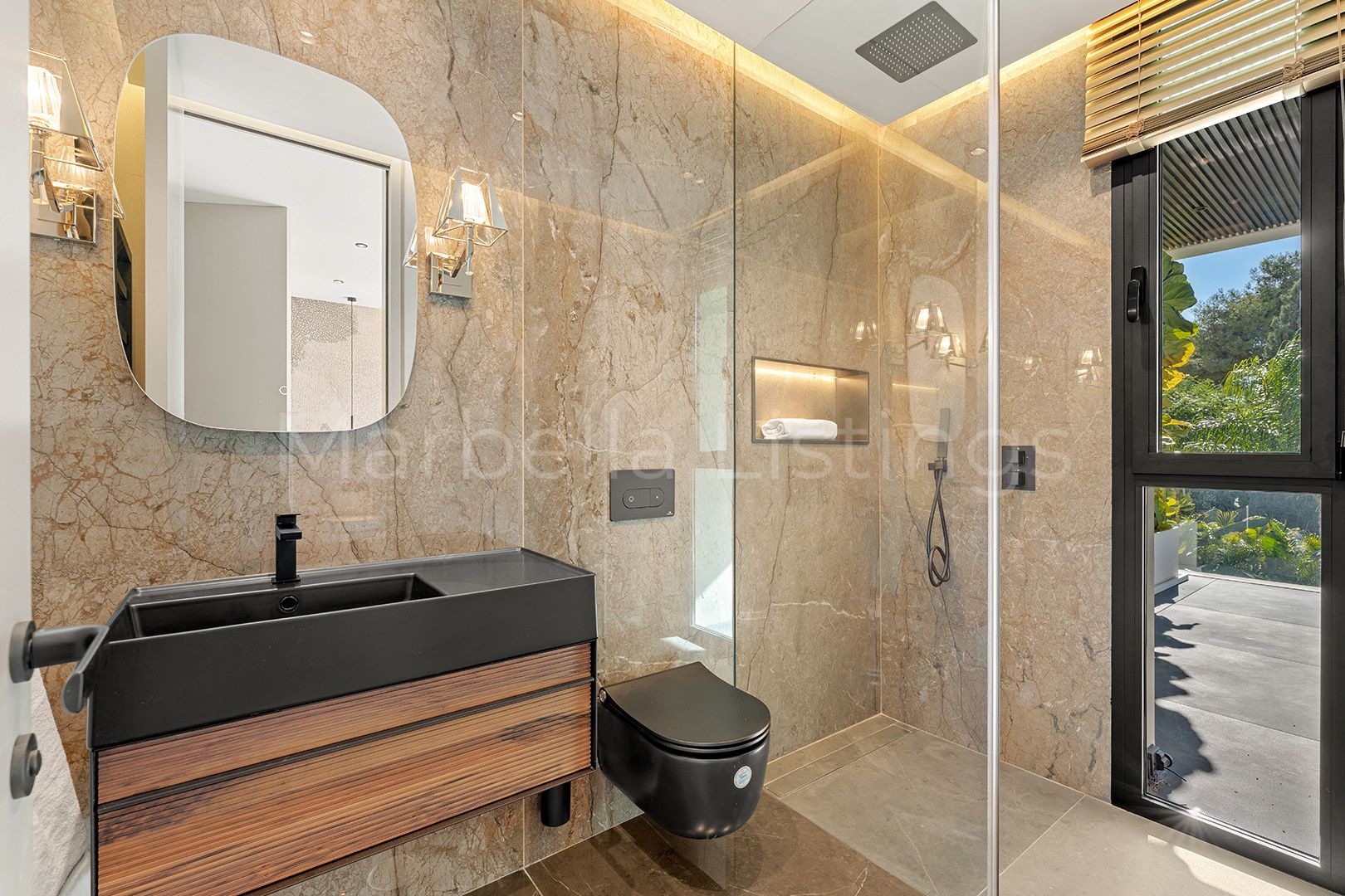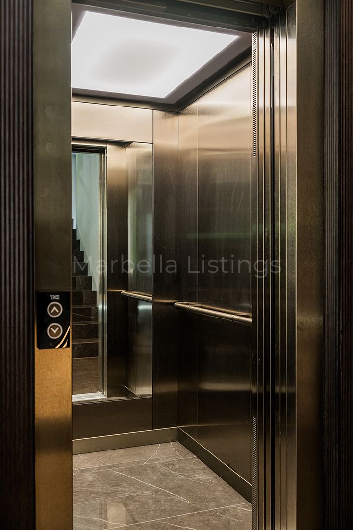 The villa is surrounded by mature pine trees and vegetation that provide privacy and a peaceful environment. Distributed over four levels connected by a champagne-gold elevator, it offers a fluid and elegant living experience.