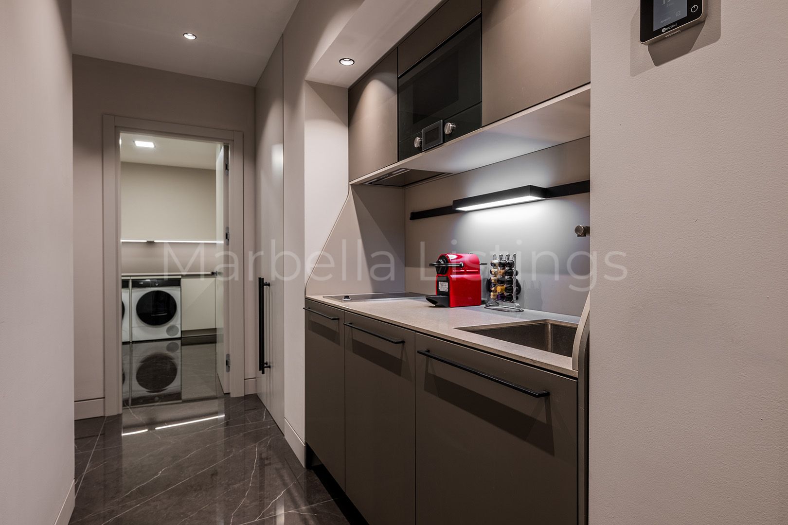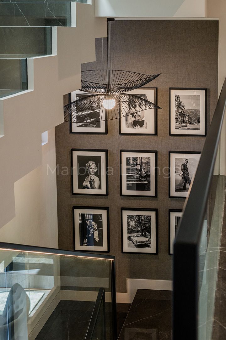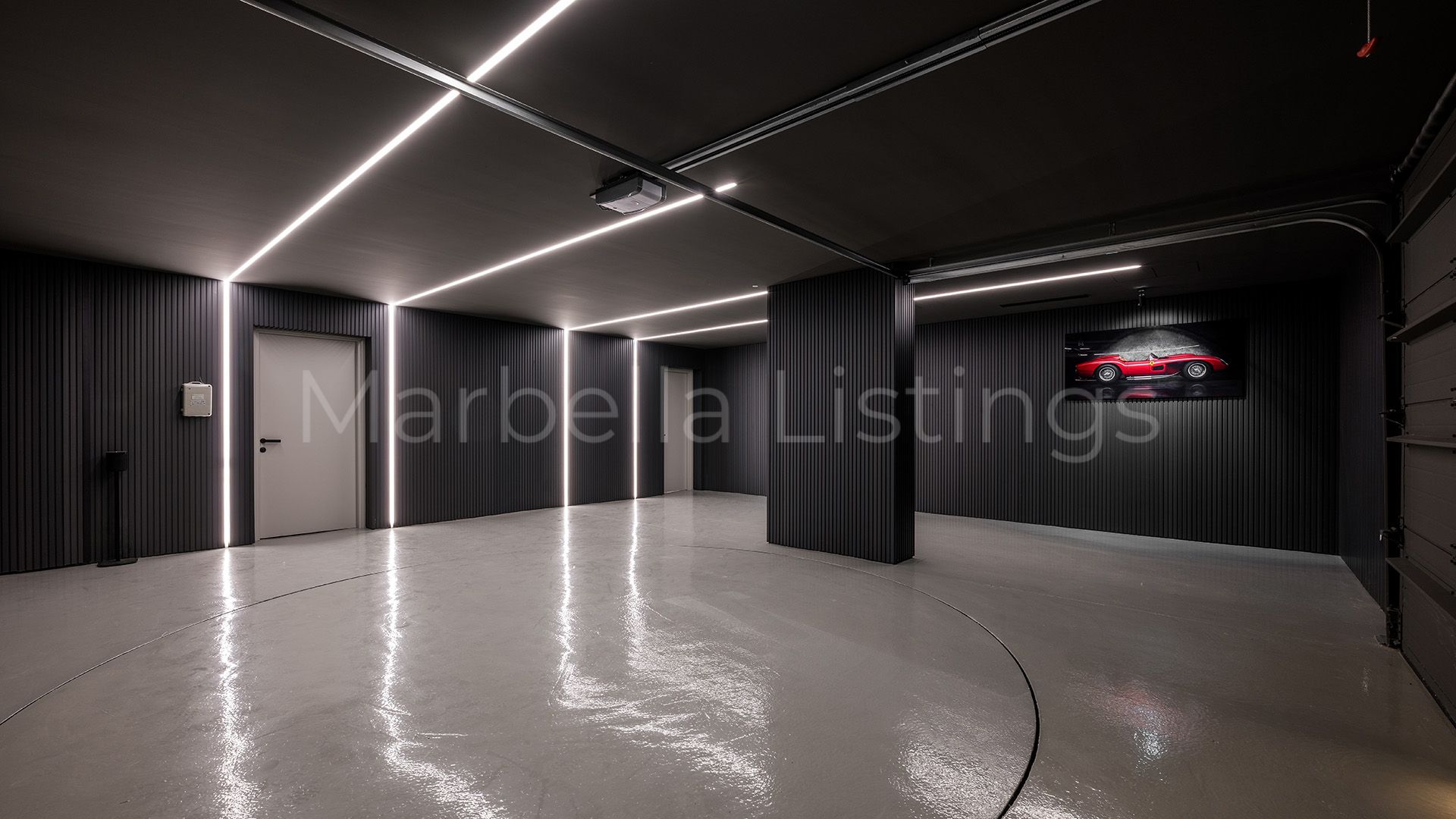On the lower floor, the villa has a gym with Technogym equipment, a Finnish sauna and steam room, a massage room, a whirlpool, a wine cellar with air conditioning and a small kitchen. The garage includes a turntable and a charging point for electric vehicles.